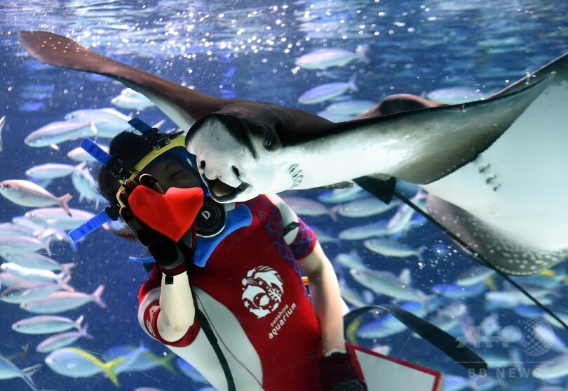 【2月11日 AFP】都内のサンシャイン水族館(Sunshine Aquarium)では、2月14日のバレンタインデーに合わせ、動物たちにバレンタインにちなんだプレゼントを贈るショーが開催されている。(c)AFP