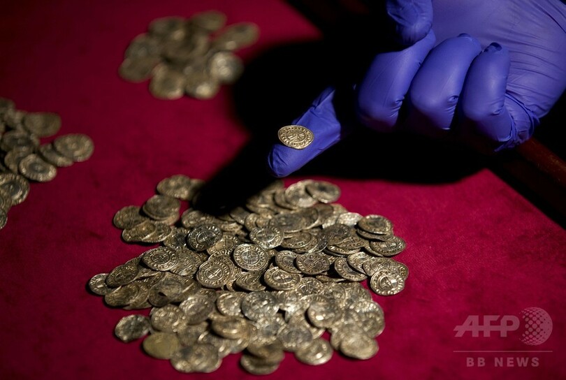 1996年の英国財宝法(Treasure Act 1996)制定以降に発見されたアングロサクソン人の硬貨の宝物としては最大規模という。(c)AFP