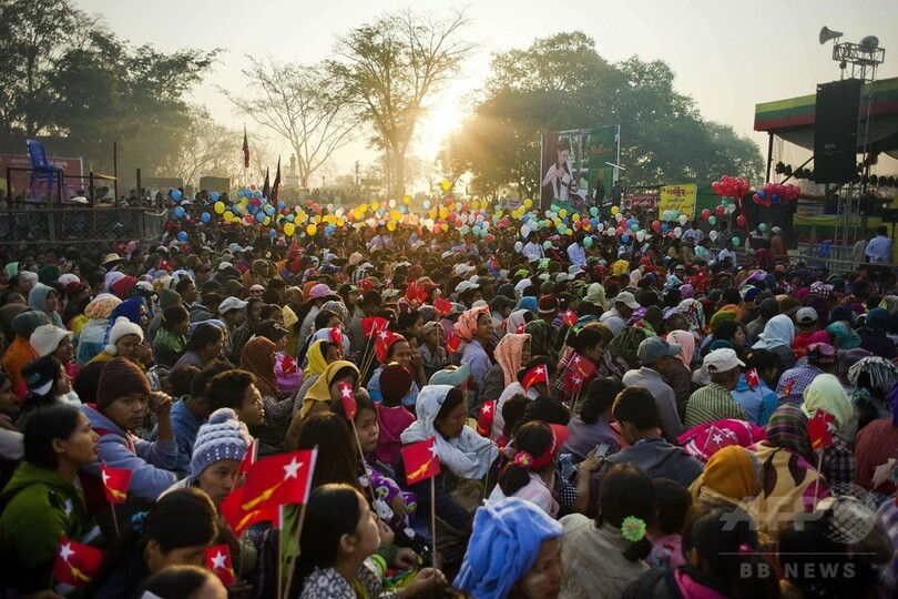 アウン・サン将軍生誕の地、ナッマウ(Natmauk)に集まった数千人の群衆にスー・チー氏は大歓迎を受けた。年内に実施される予定の総選挙を控え、スー・チー氏は父から受け継いだ人気の高さを見せつけた。(c)AFP