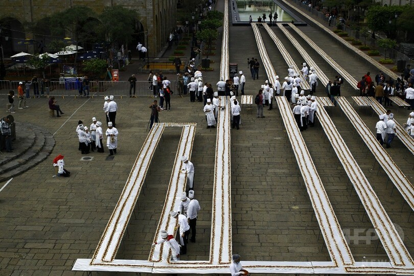 【2月16日 AFP】メキシコ・グアダラハラ(Guadalajara)で15日、「コチニータ・ピビル(Tacos de Cochinita Pibil)」と呼ばれるメキシコ料理のタコスが8万個以上、全長2.5キロにわたって並べられ、並べられたタコスの数で世界記録を更新した。「コチニータ・ピビル」は、マリネした豚肉の伝統的な料理。(c)AFP