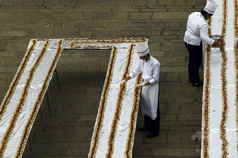 【2月16日 AFP】メキシコ・グアダラハラ(Guadalajara)で15日、「コチニータ・ピビル(Tacos de Cochinita Pibil)」と呼ばれるメキシコ料理のタコスが8万個以上、全長2.5キロにわたって並べられ、並べられたタコスの数で世界記録を更新した。「コチニータ・ピビル」は、マリネした豚肉の伝統的な料理。(c)AFP