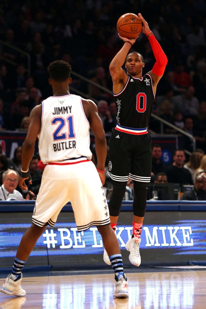 守備をほとんどせずに派手なプレーが目立つオールスターゲームで、ウエストブルックは前半終了時点での新記録となる27得点を稼ぐと、最後は試合を締めくくる2本のフリースローを成功させた。
