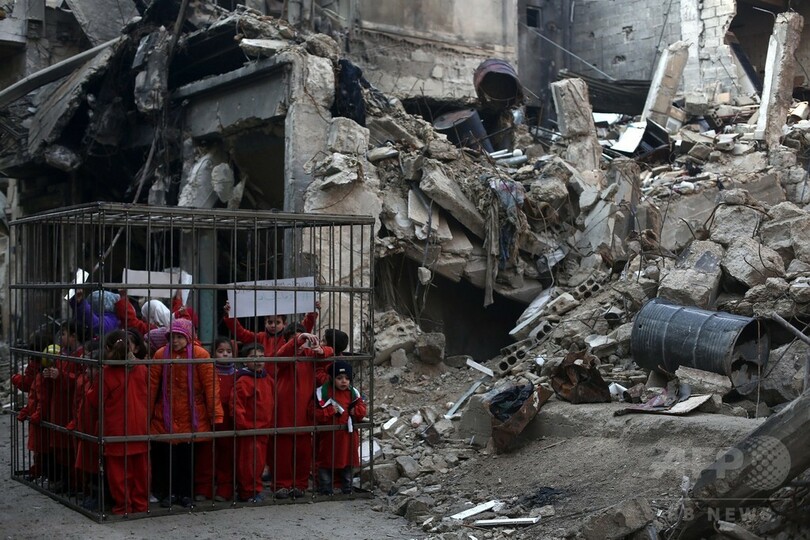 【2月17日 AFP】内戦下にあるシリアの首都ダマスカス(Damascus)近郊の反体制派が掌握するドゥマ(Douma)で15日、増え続ける民間人の犠牲者や、内戦終結に向けた国際社会の努力不足に抗議する地元の活動家らが、子どもたちにオレンジ色の服を着せておりに入れる抗議活動を行った。イスラム過激派組織「イスラム国(Islamic State、IS)」によるヨルダン人パイロット焼殺事件を再現したもの。おりは、政府軍の攻撃により破壊された建物のがれきの隣に置かれた。(c)AFP/ABD DOUMANY