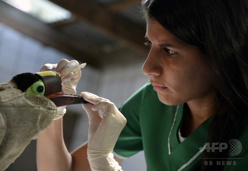 【2月18日 AFP】写真はコスタリカ第2の都市、アラフエラ(Alajuela)にある動物救護センターで、何者かに羽を折られたため治療を受けているタカと獣医師のカルメン・ソトさん。中南米諸国では動物が襲われる事例が少なくないにもかかわらず、動物虐待を処罰する法律の整備が不十分だったり、全く存在しなかったりする場合が多い。また動物虐待と闘う愛護団体などのネットワークも小規模で資金が不足気味だ。