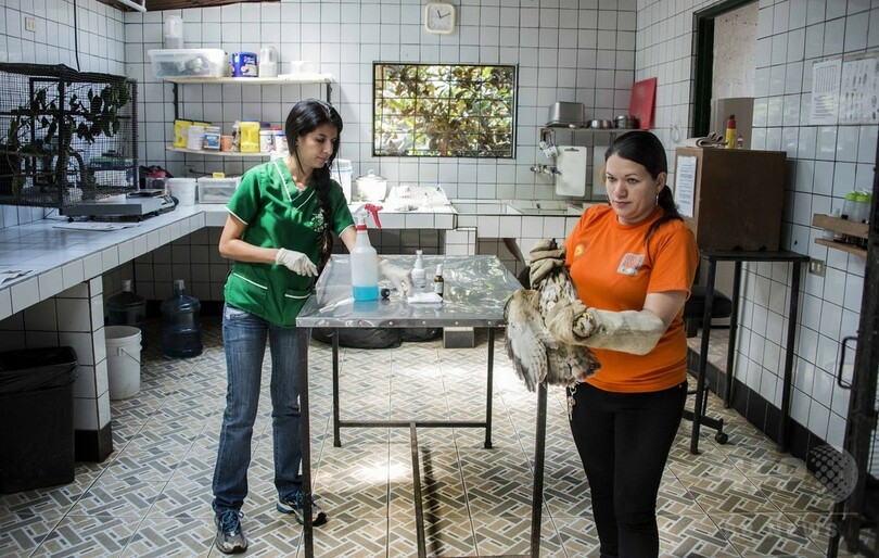 【2月18日 AFP】写真はコスタリカ第2の都市、アラフエラ(Alajuela)にある動物救護センターで、何者かに羽を折られたため治療を受けているタカと獣医師のカルメン・ソトさん。中南米諸国では動物が襲われる事例が少なくないにもかかわらず、動物虐待を処罰する法律の整備が不十分だったり、全く存在しなかったりする場合が多い。また動物虐待と闘う愛護団体などのネットワークも小規模で資金が不足気味だ。