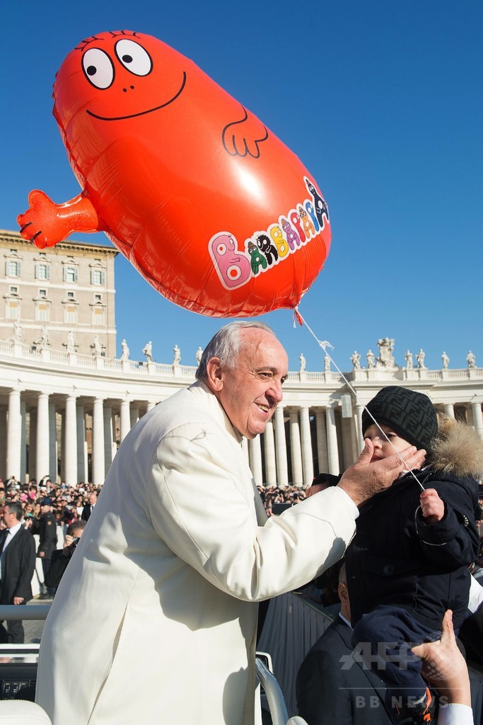 【2月19日 AFP】バチカンのサンピエトロ広場(St Peter's Square)で18日、ローマ・カトリック教会のフランシスコ(Francis)法王が毎週行う一般謁見で、「バーバパパ(Barbapapa)」のキャラクター、バーバブラボー(Barbabravo)の風船を持った子どもを祝福する一幕が見られた。(c)AFP