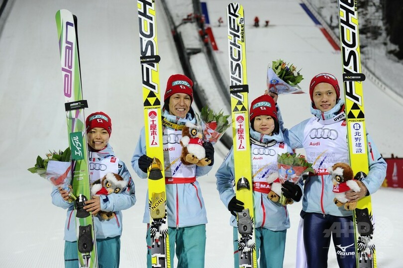 【2月23日 AFP】ノルディックスキー世界選手権(Nordic World Ski Championships 2015)は22日、スウェーデンのファールン(Falun)でジャンプ混合団体が行われ、日本は銅メダルを獲得した。