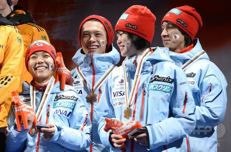 【2月23日 AFP】ノルディックスキー世界選手権(Nordic World Ski Championships 2015)は22日、スウェーデンのファールン(Falun)でジャンプ混合団体が行われ、日本は銅メダルを獲得した。