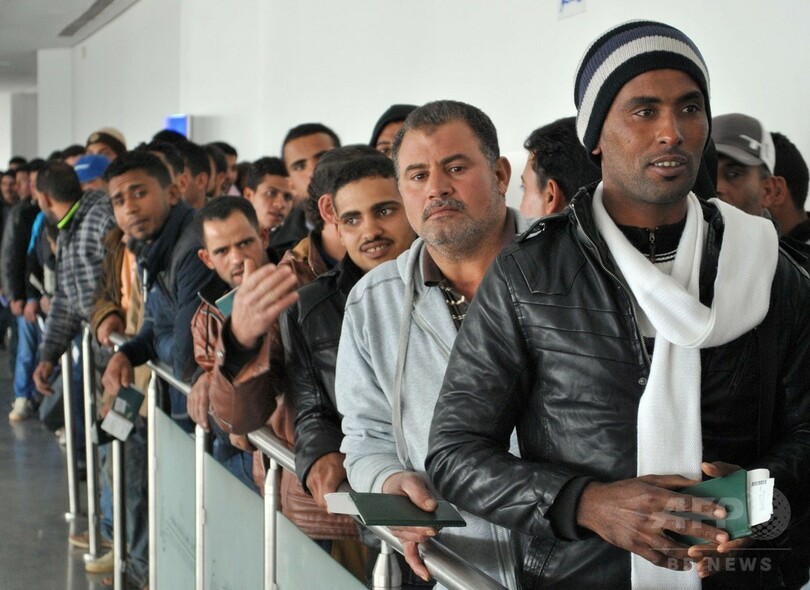 MENAによると、23日だけで3018人のエジプト人がエジプト北西部サルーム(Sallum)の国境検問所を通じて帰国。ただ、うち何人がキリスト教徒だったかについては報じていない。またチュニジアの航空当局によると20日以降、少なくとも1000人のエジプト人が政府のチャーター機で帰還した。(c)AFP