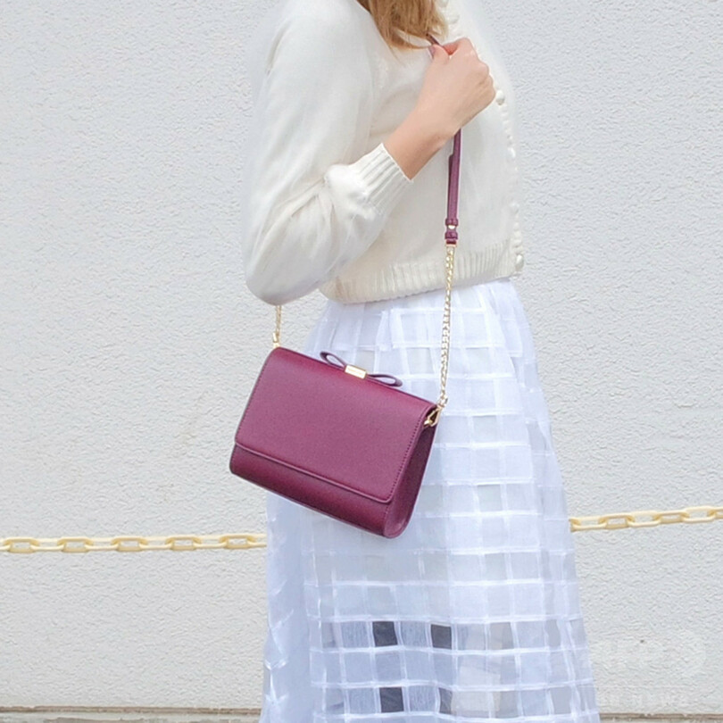 バッグの上品なデザインに合わせてホワイトアイテムをコーディネートし、グッドガールなイメージに。