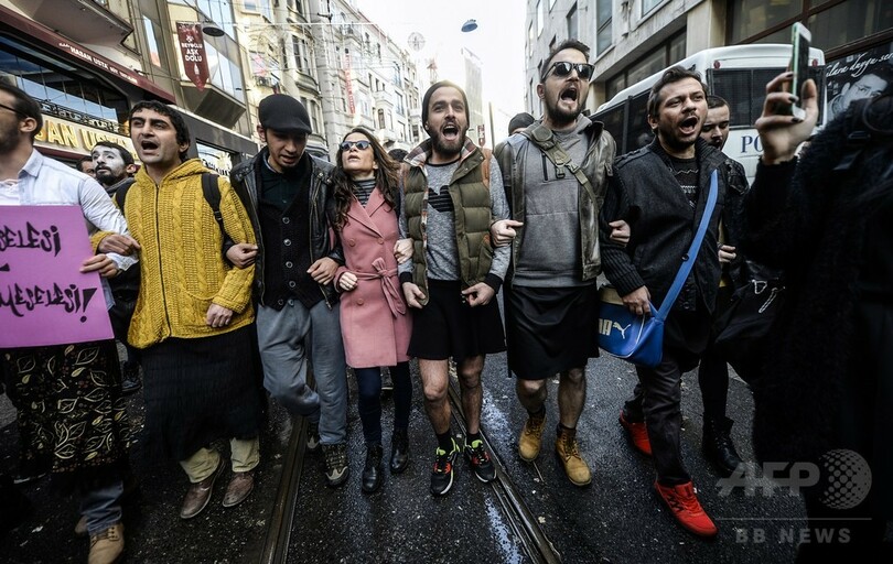 デモのきっかけとなったのは、大学生のオズゲジャン・アスラン(Ozgecan Aslan)さん(20)が性的暴行を目的としたバス運転手に殺害された事件で、市民の間に怒りが広がり、活動家らが主導する抗議デモがイスタンブール(Istanbul)で行われた。女性に対する暴力の根絶を訴えるデモにはスカートをはいた男性数十人が参加した。