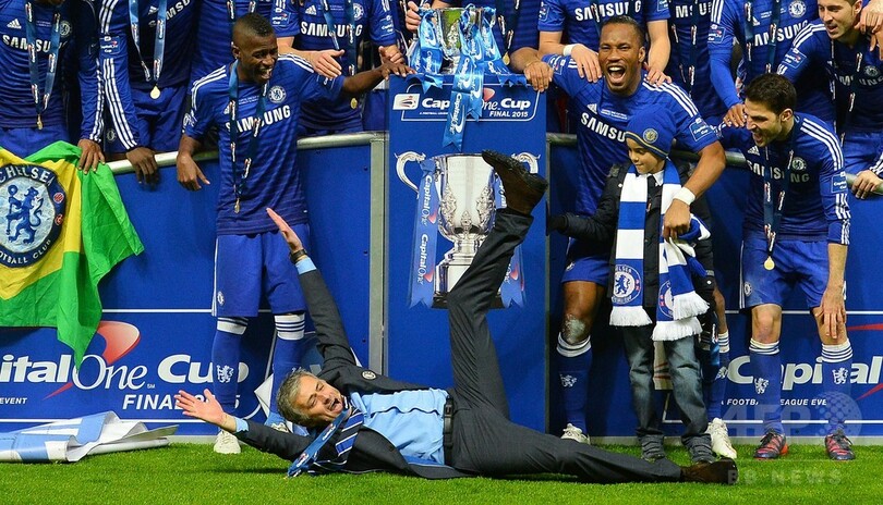 トロフィー授与式の後にピッチで選手たちとはしゃいだチェルシーのジョゼ・モウリーニョ(Jose Mourinho)監督は、第1次政権での2度の優勝に次ぐ通算3度目のリーグ杯制覇で、2013年の指揮官復帰後では初となるタイトルを獲得している。(c)AFP