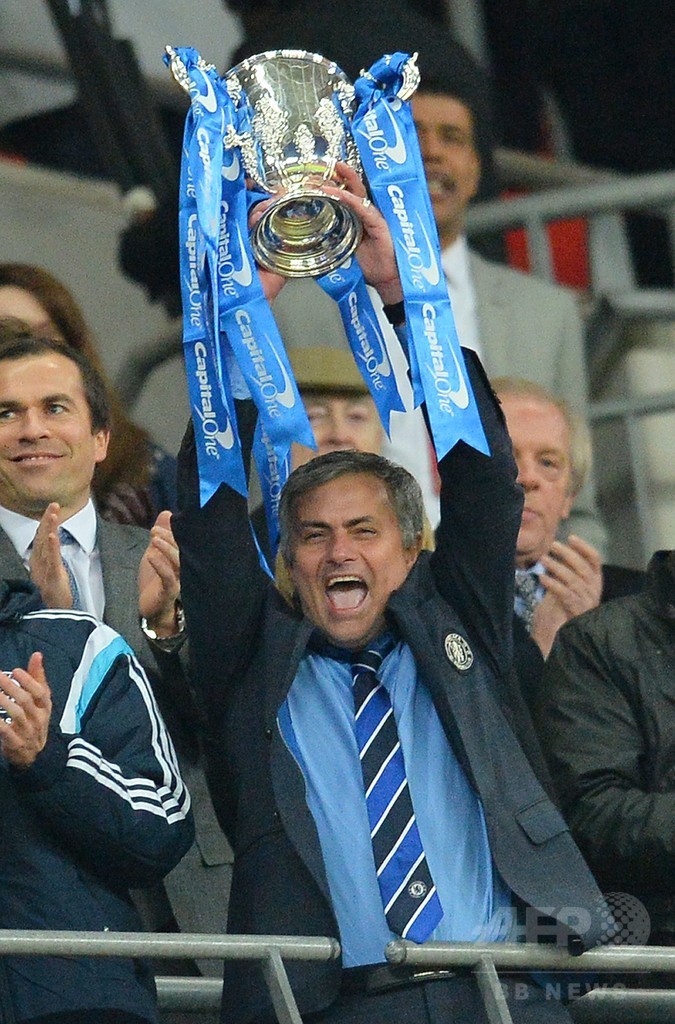 トロフィー授与式の後にピッチで選手たちとはしゃいだチェルシーのジョゼ・モウリーニョ(Jose Mourinho)監督は、第1次政権での2度の優勝に次ぐ通算3度目のリーグ杯制覇で、2013年の指揮官復帰後では初となるタイトルを獲得している。(c)AFP