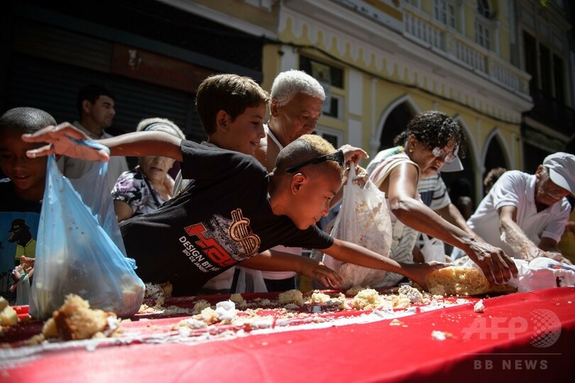 【3月2日 AFP】ブラジル・リオデジャネイロ(Rio de Janeiro)市で、1565年の同市誕生からちょうど450年となる1日、長さ450メートルの巨大ケーキが市民たちに振る舞われた。