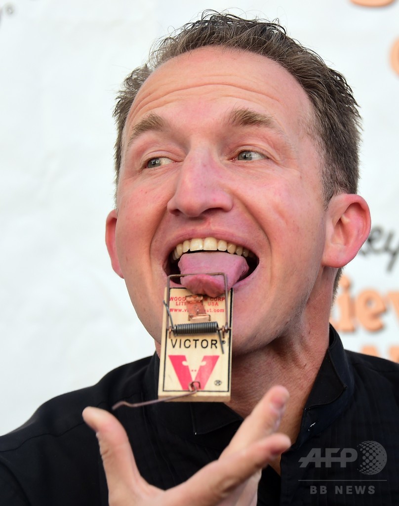 米ハリウッドで行われた「国際剣のみデー」のイベントで、余興にネズミ捕りで舌を挟んでみせるロビン・マークスさん(2015年2月28日撮影)。(c)AFP/FREDERIC J. BROWN