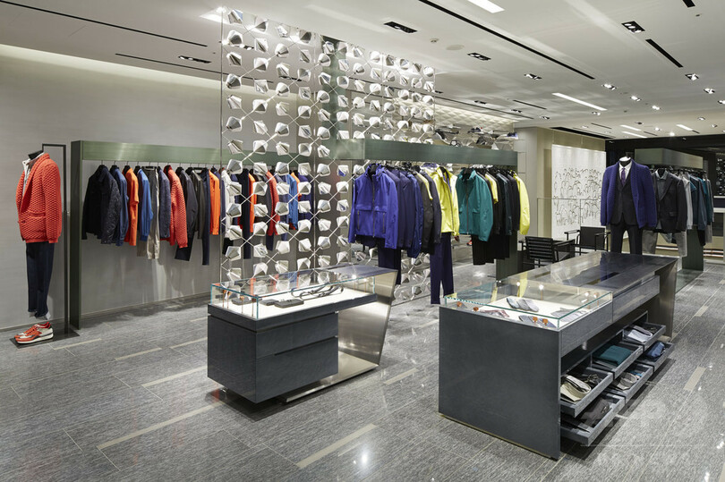 アジア最大、世界でも2番目の規模を誇る広さ700平米のストアを手がけたのは、世界的建築家のピーター・マリーノ(Peter Marino)氏。イタリア・トリヴェロにあるウール工場「ラニフィーチョ エルメネジルド ゼニア」で100年以上にわたり生み出されてきたファブリックをアイデアソースにデザインした空間で、「エルメネジルド ゼニア」の全コレクションを展開する。