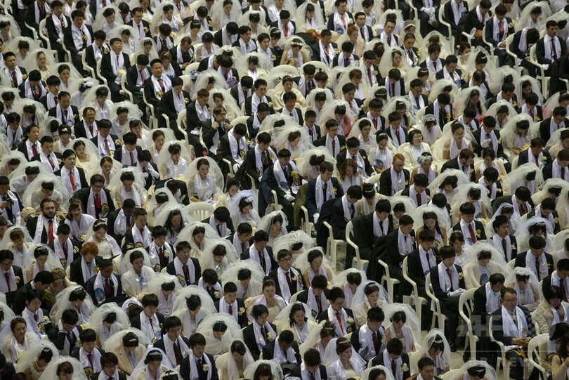 同教会の合同結婚式は、自身をイエス・キリストの再来と称し批判も多かった創始者の文鮮明(Moon Sun-Myung)氏が死去してから3回目。結婚式に参加した3800組のなかには、わずか数日前に出会ったばかりというカップルもいた。(c)AFP