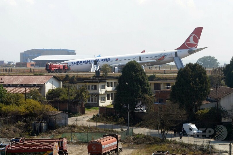 【3月4日 AFP】ネパールの首都カトマンズ(Kathmandu)の国際空港で4日、乗客224人を乗せたトルコ航空(Turkish Airlines)の旅客機が着陸の際に滑走路を外れ、脇の草地に進入する事故があった。