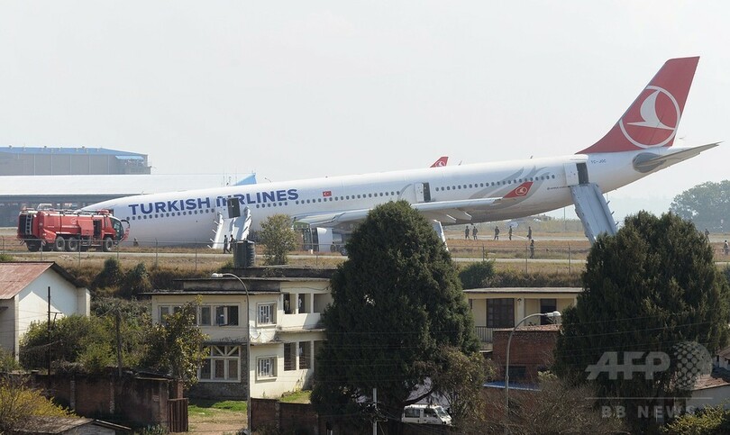 【3月4日 AFP】ネパールの首都カトマンズ(Kathmandu)の国際空港で4日、乗客224人を乗せたトルコ航空(Turkish Airlines)の旅客機が着陸の際に滑走路を外れ、脇の草地に進入する事故があった。