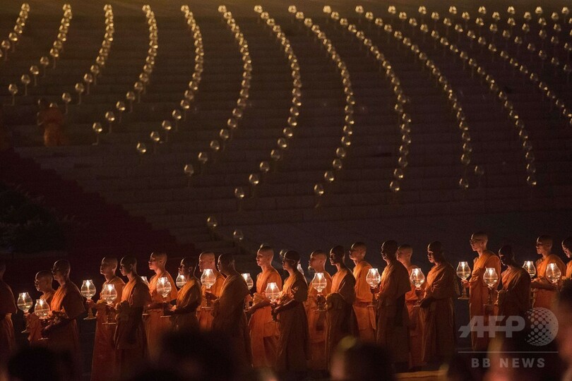 幻想的なろうそくの灯火、タイ寺院で「万仏節」行事