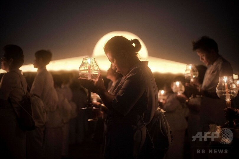 幻想的なろうそくの灯火、タイ寺院で「万仏節」行事