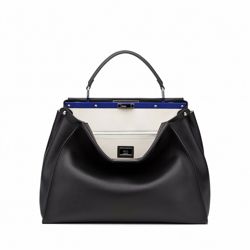 今回リニューアルオープンを記念して、2015年春夏コレクションのランウェイでひと際注目を集めた「ピーカブー(PEEKABOO)」の新色の先行発売を実施する。シンプルなブラックレザーのボディに、ミルクホワイトのライニング、さらにメタルバーをブルーのレザーでカバーした、美しいカラーコントラストが特徴だ。英語で「いない、いない、ばあ!」を意味するその名の通り、バッグの口を開けると外側とは違った表情のライニングが顔をのぞかせる、「フェンディ」ならではの遊び心満載のアイコンバッグだ。