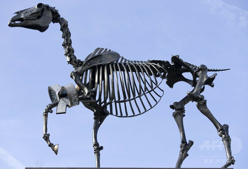 「馬の骸骨」の彫刻、英ロンドン・トラファルガー広場に登場