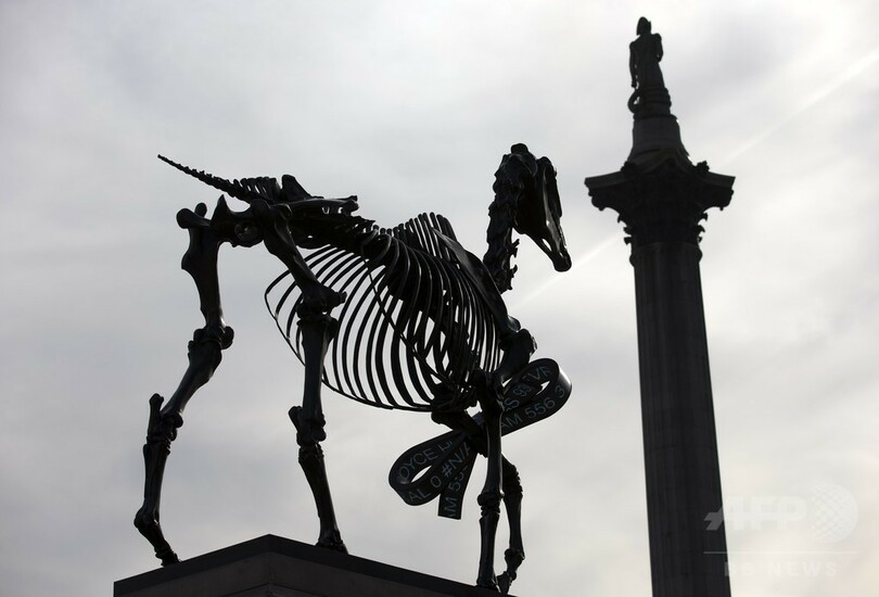 「馬の骸骨」の彫刻、英ロンドン・トラファルガー広場に登場