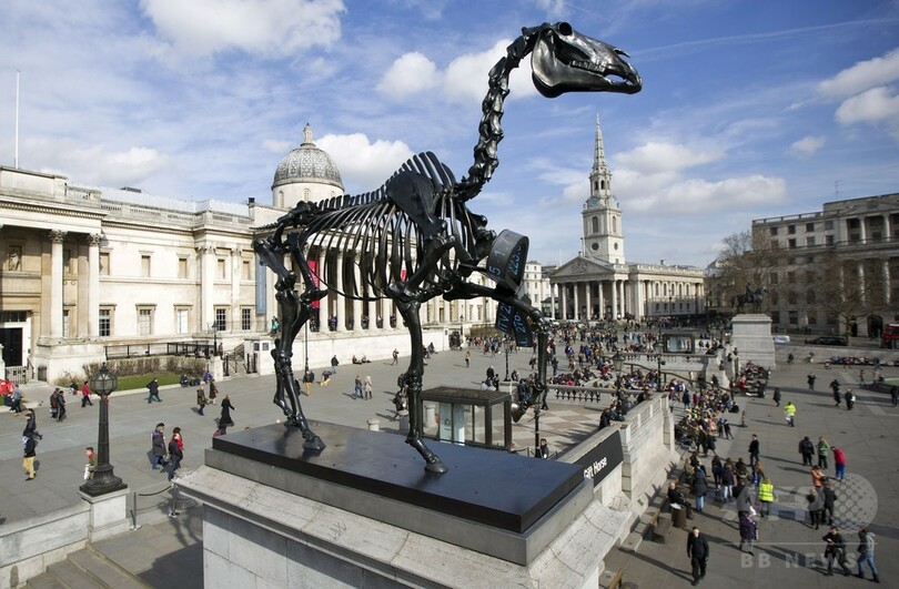 「馬の骸骨」の彫刻、英ロンドン・トラファルガー広場に登場