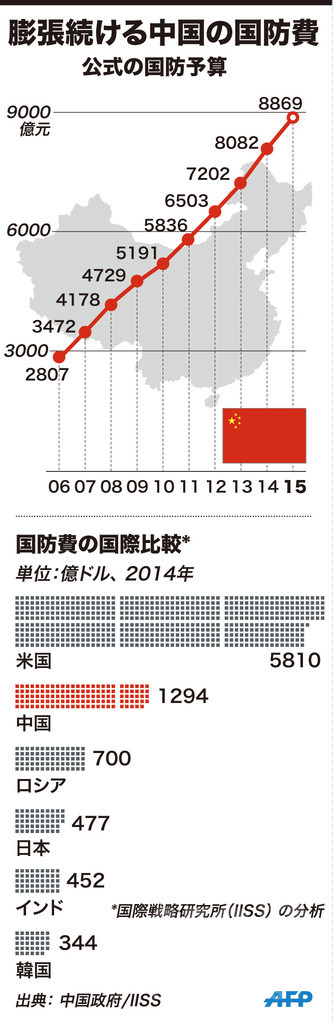 【3月6日 AFP】膨張を続ける中国の国防費の推移および他国との比較を示した図。中国政府は全国人民代表大会(全人代)で、2015年の国防予算は約8869億元(約17兆円)になると発表。公式統計によれば、国防費の伸び率は昨年度で12.2%増で、今年度は10.1%増となる。(c)AFP