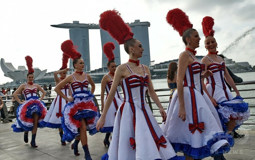 シンガポールは今年、建国50周年を迎える。ムーランルージュは7日開かれた建国50周年祝賀会でパフォーマンスを披露していたた。(c)AFP