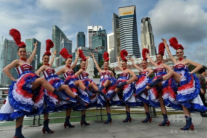 シンガポールは今年、建国50周年を迎える。ムーランルージュは7日開かれた建国50周年祝賀会でパフォーマンスを披露していたた。(c)AFP