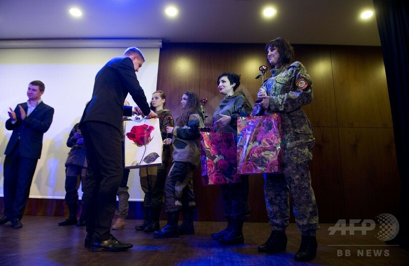 【3月9日 AFP】国連(UN)が定める8日の「国際女性デー(International Women's Day)」の前日、ウクライナからの分離独立を求める親ロシア派が拠点とする東部ドネツク(Donetsk)で、女性戦闘員たちがファッションショーに出演した。親ロシア派武装勢力の女性戦闘員たち10人が、戦闘服からイブニングドレスに着替え、同僚や親ロシア派指導者たちも見守る中、即席のキャットウオークを歩いた。(c)AFP