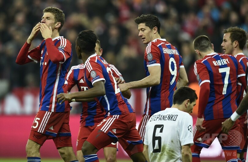 【3月12日 AFP】サッカー欧州チャンピオンズリーグ2014-15(UEFA Champions League 2014-15)は11日、決勝トーナメント1回戦の第2戦が行われ、バイエルン・ミュンヘン(Bayern Munich)は7-0でシャフタール・ドネツク(Shakhtar Donetsk)に勝利し、2戦合計スコア7-0で準々決勝に進出した。