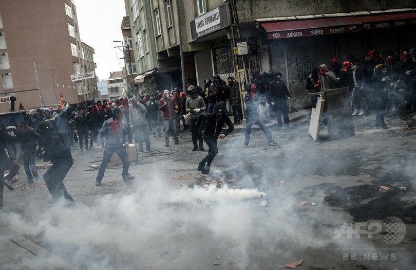 衝突が起きたのはイスタンブールのオクメイダヌ(Okmeydani)地区で、現場のAFPカメラマンによると、デモの参加者の一部が花火や火炎瓶を投げつけ、警官隊が放水や催涙ガスで応酬した。
