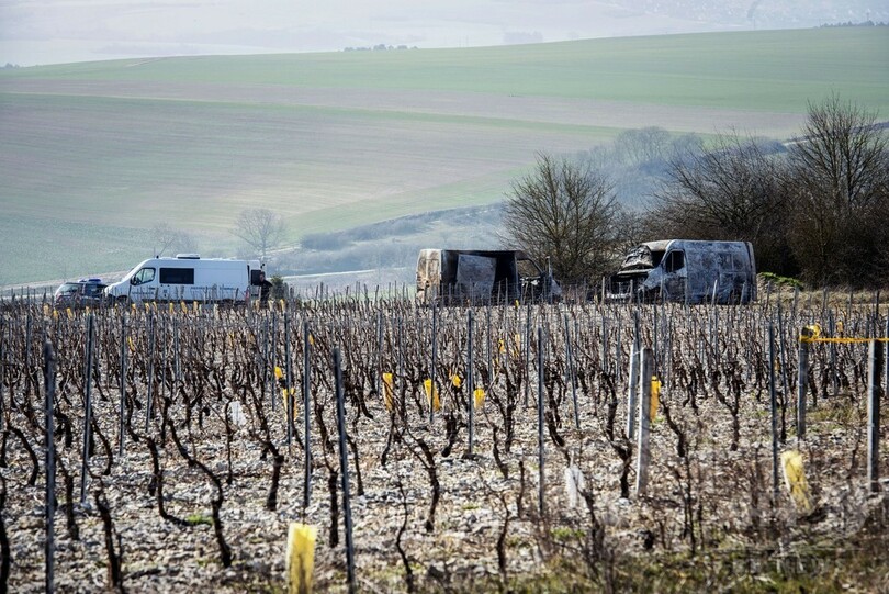 宝石を運んでいた輸送車2台は、現場の料金所からさほど遠くない場所に乗り捨てられているのが発見された。いずれも焼けこげ、1台は完全に破壊されていた。警察はヘリコプターも動員し、広範囲にわたって周辺を捜査している。(c)AFP/Gregory Danel with Pauline Talagrand in Paris