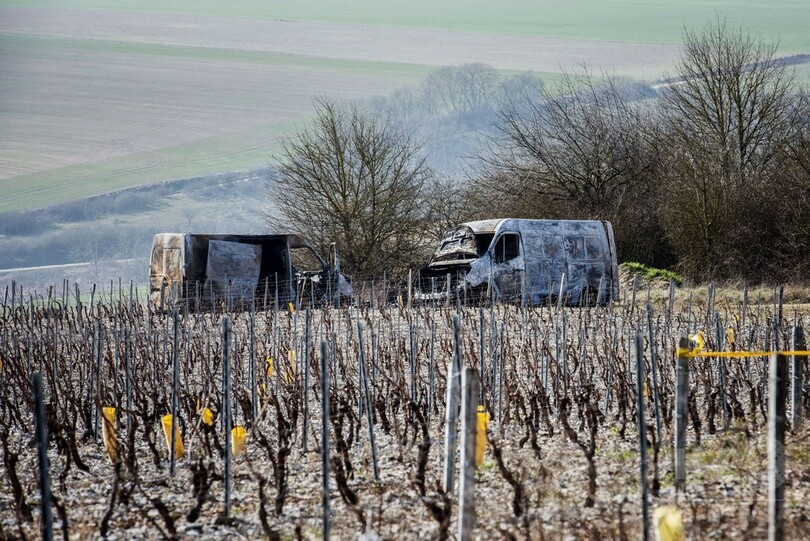 宝石を運んでいた輸送車2台は、現場の料金所からさほど遠くない場所に乗り捨てられているのが発見された。いずれも焼けこげ、1台は完全に破壊されていた。警察はヘリコプターも動員し、広範囲にわたって周辺を捜査している。(c)AFP/Gregory Danel with Pauline Talagrand in Paris