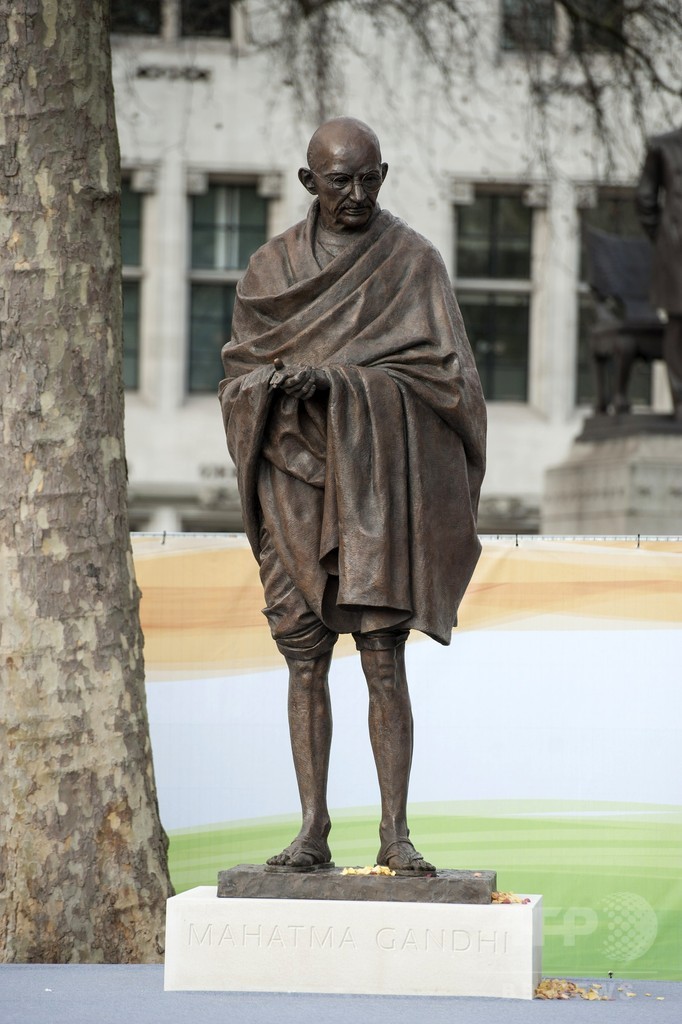 銅像は高さ約2.7メートルで、ガンジーが1931年にロンドンを訪れた際の写真を基に著名彫刻家のフィリップ・ジャクソン(Philip Jackson)氏が制作した。今年はガンジーが南アフリカから英国統治下にあったインドに戻り非暴力による独立運動を開始してから100年にあたる。(c)AFP/Katherine HADDON