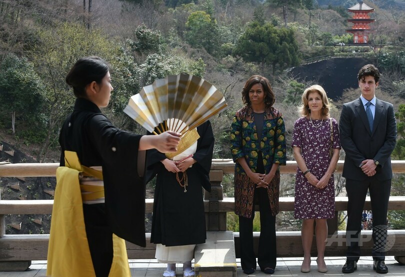 【3月20日 AFP】来日中のミシェル・オバマ(Michelle Obama)米大統領夫人は20日、京都を訪問し、清水寺(Kiyomizu-dera)でキャロライン・ケネディ(Caroline Kennedy)駐日米大使らと学生による能の舞台を観賞した。(c)AFP