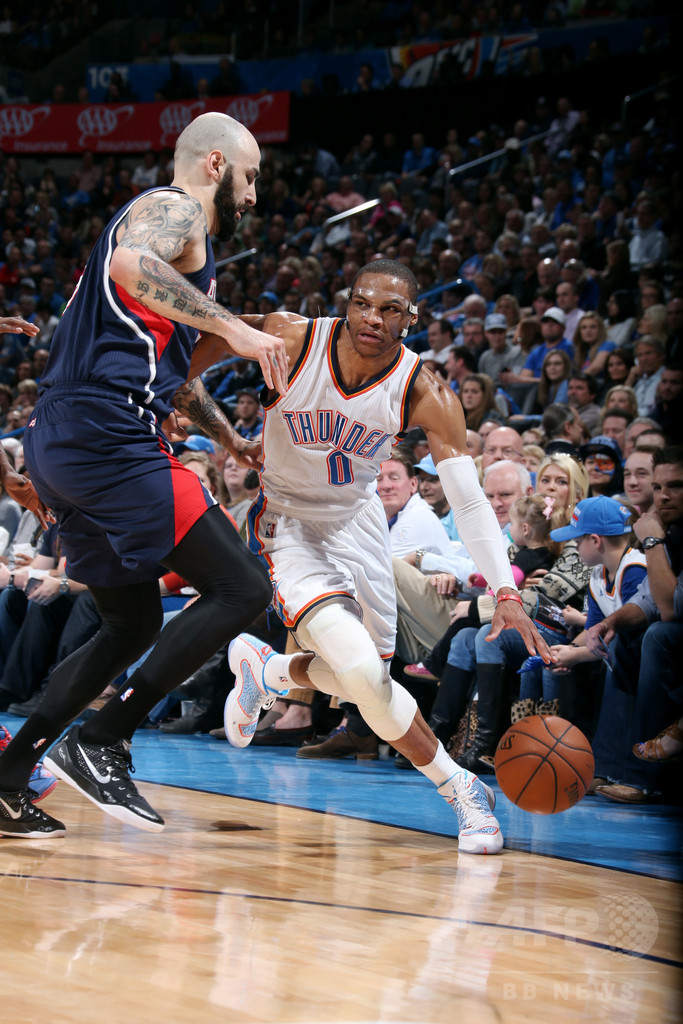 【3月21日 AFP】14-15NBAは20日、各地で試合が行われ、ラッセル・ウエストブルック(Russell Westbrook)が今季9度目のトリプルダブルを記録したオクラホマシティ・サンダー(Oklahoma City Thunder)が、123-115でイースタンカンファレンス首位のアトランタ・ホークス(Atlanta Hawks)に勝利した。