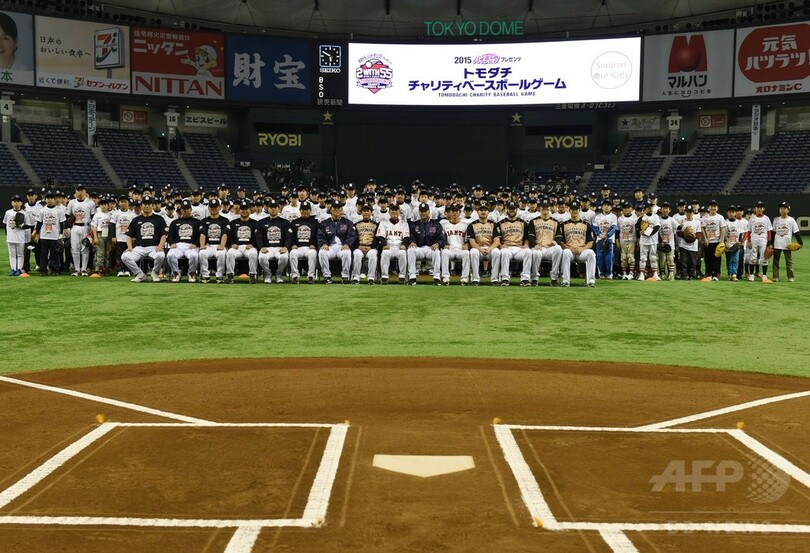 【3月22日 AFP】米大リーグ(MLB)のニューヨーク・ヤンキース(New York Yankees)で一緒にプレーした松井秀喜(Hideki Matsui)氏とデレク・ジーター(Derek Jeter)氏が21日、東京ドーム(Tokyo Dome stadium)で開催された東日本大震災で被災した子どもたちを支援するイベント「2015トモダチチャリティベースボールゲーム(Tomodachi Charity Baseball Game)」に参加し、野球教室を開いた。(c)AFP