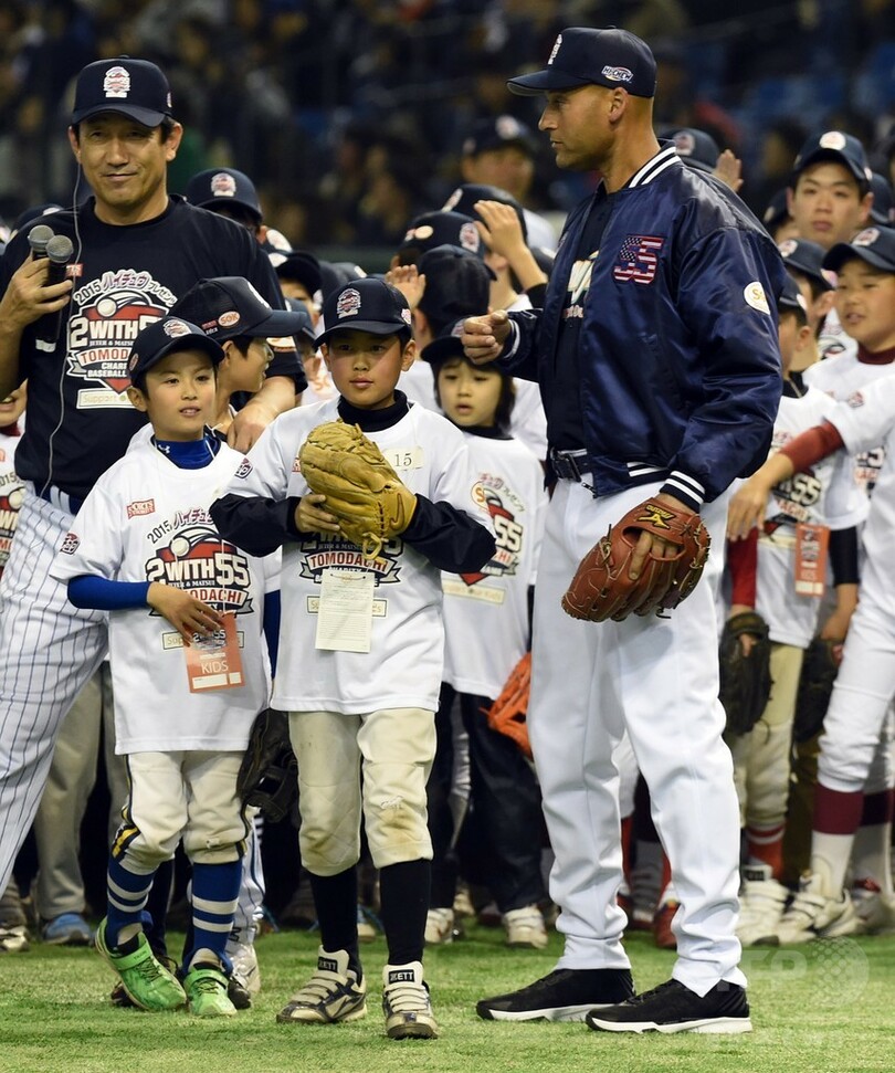 【3月22日 AFP】米大リーグ(MLB)のニューヨーク・ヤンキース(New York Yankees)で一緒にプレーした松井秀喜(Hideki Matsui)氏とデレク・ジーター(Derek Jeter)氏が21日、東京ドーム(Tokyo Dome stadium)で開催された東日本大震災で被災した子どもたちを支援するイベント「2015トモダチチャリティベースボールゲーム(Tomodachi Charity Baseball Game)」に参加し、野球教室を開いた。(c)AFP