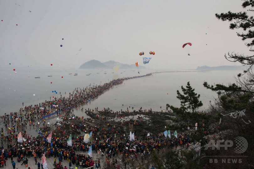 【3月23日 AFP】韓国・南西部にある珍島(Jindo)で20日~23日までの4日間、「珍島、神秘の海割れ祭り(Jindo Sea Partingfestival)」が開催されている。毎年春頃、珍島と茅島(Modo)をつなぐ幅40メートルほどの道が潮汐の関係で毎日1時間ほど出現する。この祭りは地元民だけでなく観光客にも人気となっており、潮干狩りやワカメ採りを楽しむ人も多い。(c)AFP