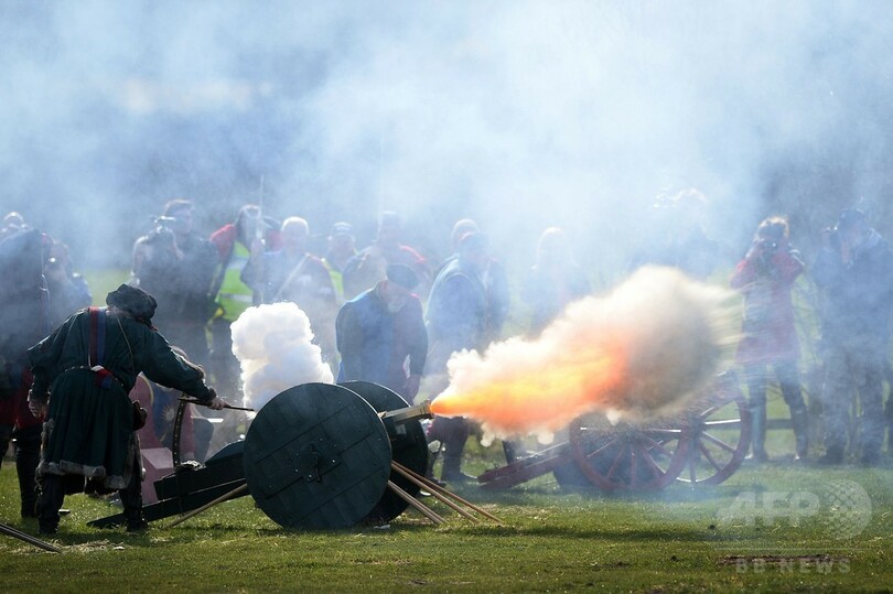 埋葬に向けた5日間の行事の初日となった22日には、リチャード3世の子孫や、遺骨を発掘した考古学者らが、ひつぎの上にリチャード3世のヨーク家を象徴する白バラを手向けた。ひつぎは、王が命を落とした同市近郊ボズワース(Bosworth)にも運ばれ、当時を再現した衣装を着た人々や、21発の礼砲で迎えられた。(c)AFP/Leon NEAL、Robin MILLARD