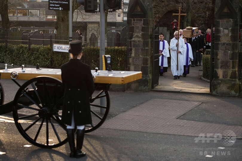【3月23日 AFP】英イングランド(England)中部レスターシャー(Leicestershire)州で22日、15世紀に戦死したイングランド王リチャード3世(Richard III)の遺骨の再埋葬に合わせた記念式典が始まり、数万人が市内の通りで王のひつぎを出迎えた。
