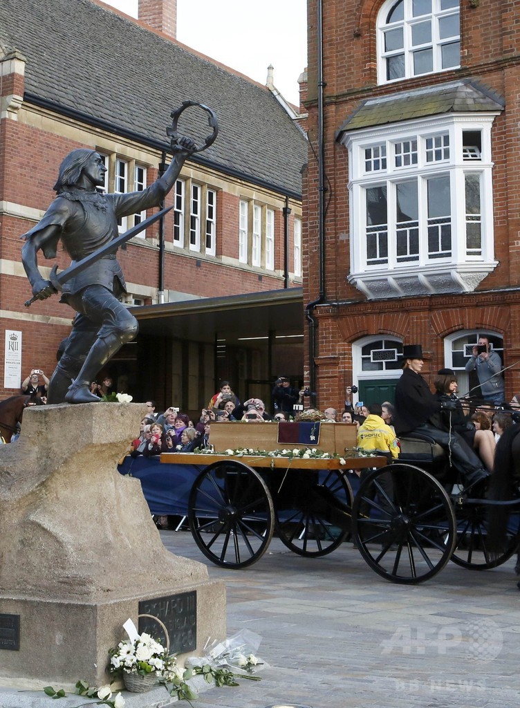 【3月23日 AFP】英イングランド(England)中部レスターシャー(Leicestershire)州で22日、15世紀に戦死したイングランド王リチャード3世(Richard III)の遺骨の再埋葬に合わせた記念式典が始まり、数万人が市内の通りで王のひつぎを出迎えた。