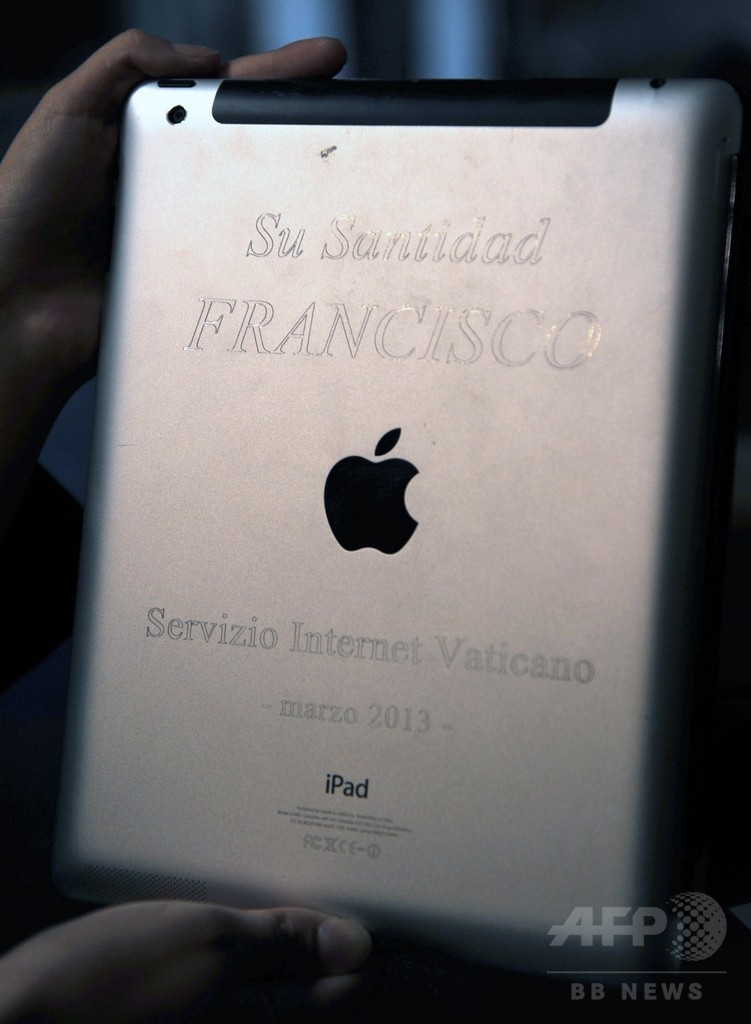 【3月26日 AFP】ローマ・カトリック教会のフランシスコ(Francis)法王所有のタブレット型端末「iPad(アイパッド)」が来月、チャリティーオークションに出品される。南米ウルグアイの首都モンテビデオ(Montevideo)では25日、出品予定のiPadが公開された。