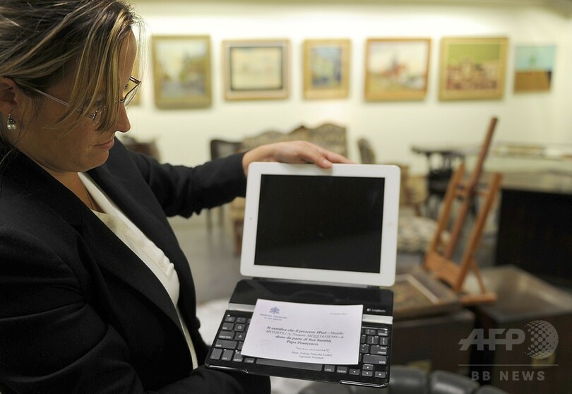 出品される法王のiPadには、本物であることを示すイタリア語の鑑定書が添えられる。オークションは、4月14日に開催予定。(c)AFP
