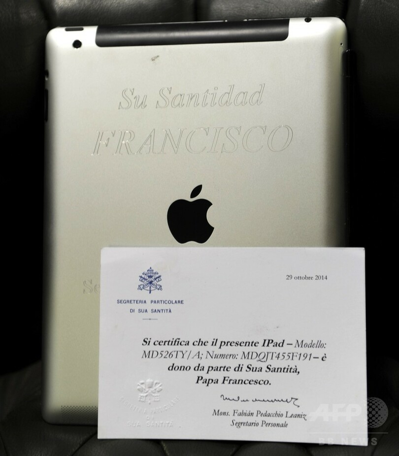【3月26日 AFP】ローマ・カトリック教会のフランシスコ(Francis)法王所有のタブレット型端末「iPad(アイパッド)」が来月、チャリティーオークションに出品される。南米ウルグアイの首都モンテビデオ(Montevideo)では25日、出品予定のiPadが公開された。
