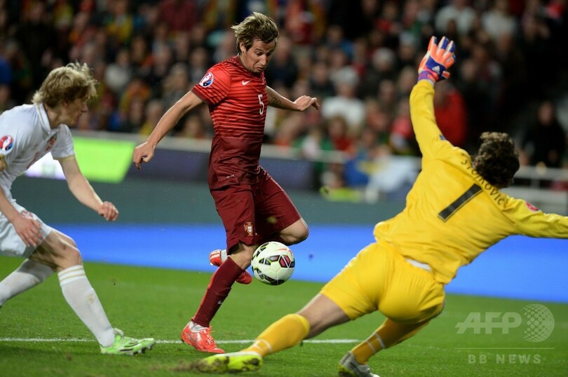 しかし、ポルトガルはその2分後、ジョアン・モウティーニョ(Joao Moutinho)のペナルティーエリアを横切る低いクロスにファーポストに走り込んだコエントランが合わせて決勝点を決め、リスボン(Lisbon)のエスタディオ・ダ・ルス(Estadio da Luz)に詰めかけた5万8000人を超える観客を歓喜に沸かせた。(c)AFP